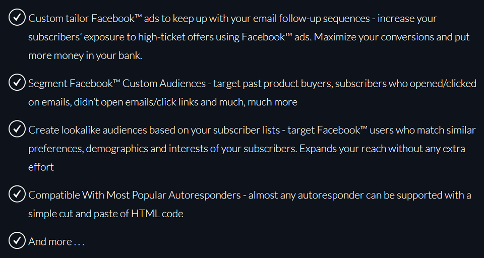 ConnectAudience is a powerful combination of email and Facebook™ Custom Audiences offering never-seen-before custom audience targeting options. The beauty of this tool is that it enables you to reach the right subscribers, which results in max conversions and massive ROI & profits.
