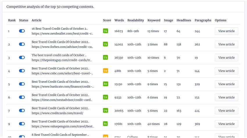 With one keyword, you can pull the top 50 search results in seconds and see word count, readability score, and outbound URLs.