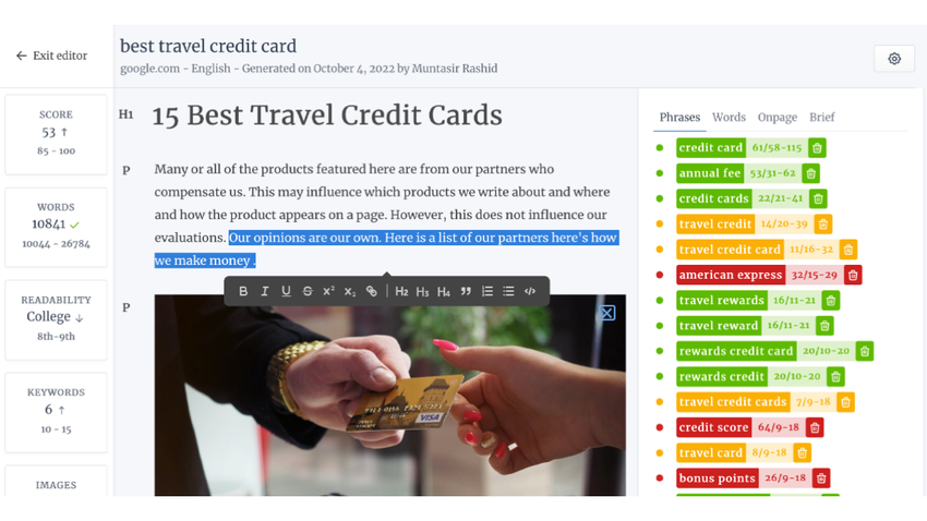 Fill topic gaps and optimize your drafts using AI-powered suggestions, like readability score, keyword count, and total word count.